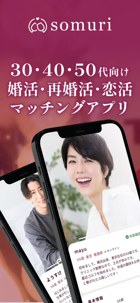 「somuri(ソムリ)」は、30代・40代・50代のための落ち着いた婚活・恋活アプリです。